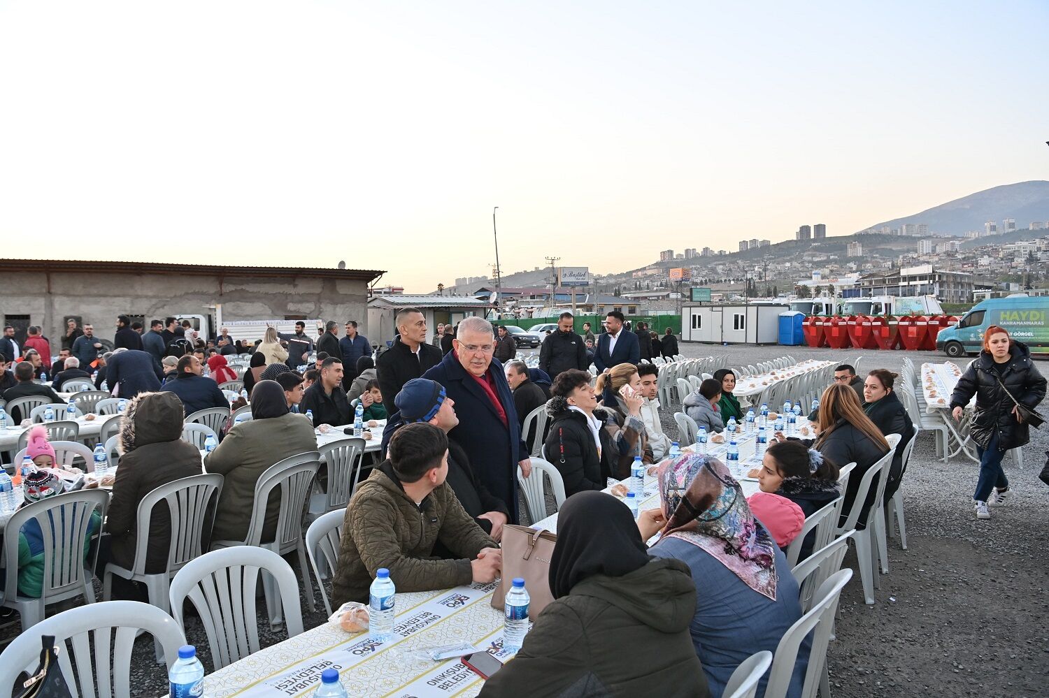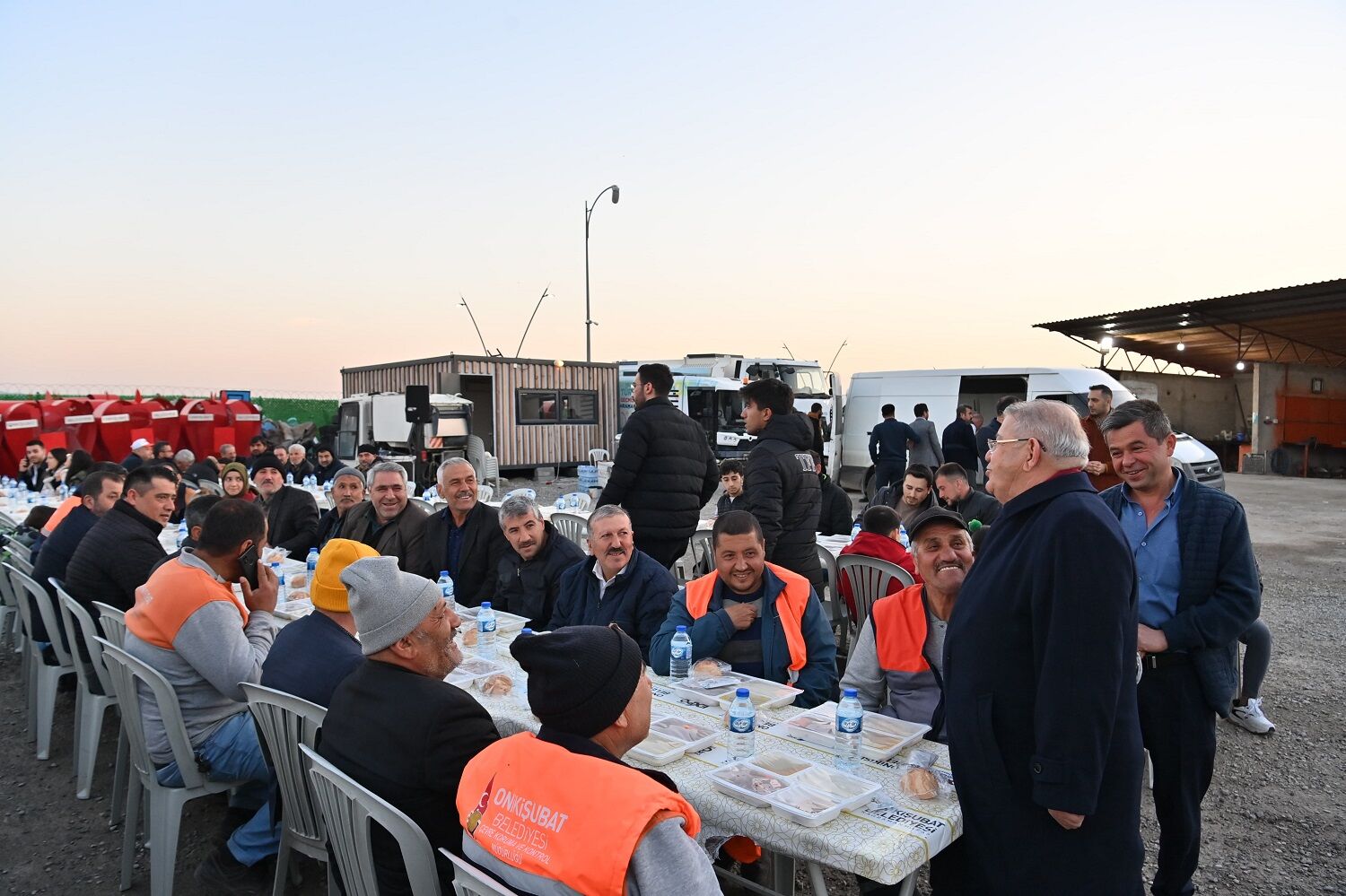 Deprem öncesinde ve sonrasında gerektiğinde ailelerini bile geri plana atarak vatandaşlara 7/24 hizmet götüren belediye personellerine, çalışma azimleri sebebiyle teşekkür eden Başkan Mahçiçek, tüm masaları tek tek dolaşarak, personeller ve ailelerinin Ramazan-ı Şerif’ini kutladı.