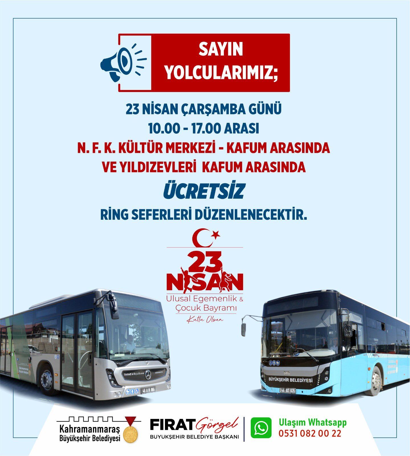 Ücretsiz otobüs seferleri, 23 Nisan Çarşamba günü saat 10.00’da başlayacak ve akşam 18.00’a kadar her saat başı hizmet verecek. Yetkililer, ailelerin ve çocukların bayram coşkusuna kolaylıkla katılabilmesi için gerekli tüm hazırlıkların tamamlandığını belirtti.