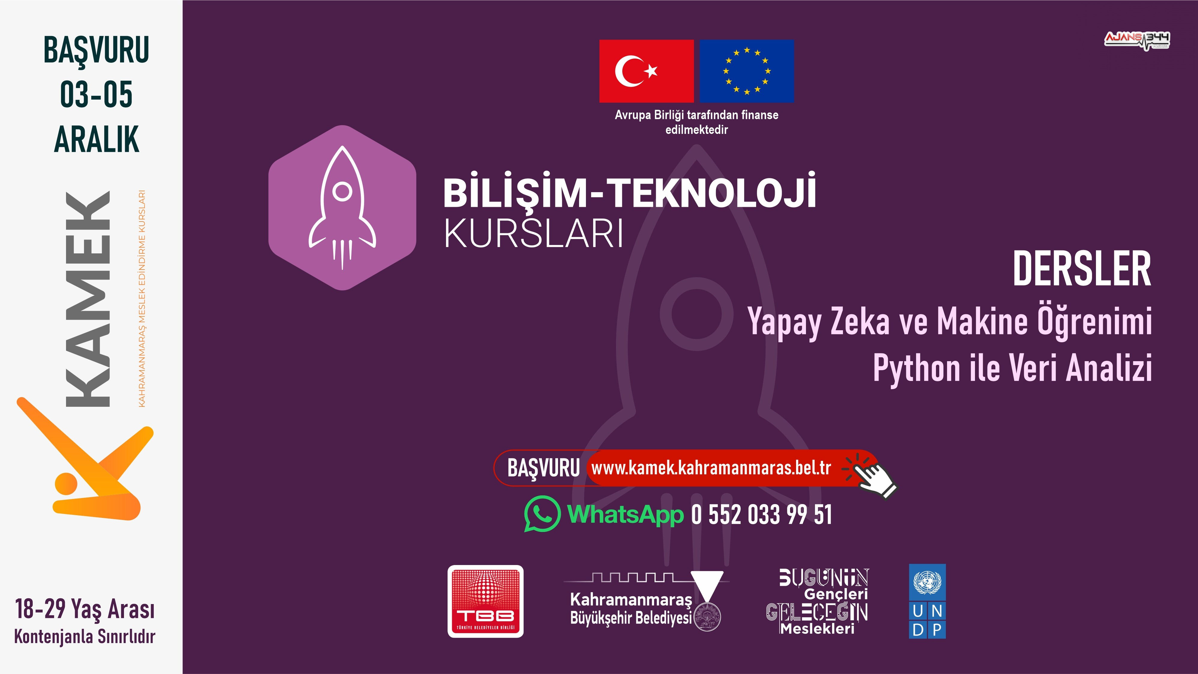 Gençlerin dijital becerilerini geliştirmek amacıyla çeşitli eğitim programları hayata geçiren Kahramanmaraş Büyükşehir Belediyesi, teknoloji odaklı yeni bir adım daha attı. Kahramanmaraş Meslek Edindirme Kursları (KAMEK) bünyesinde başlatılan “Yapay Zekâ ve Makine Öğrenimi” ile “Python ile Veri Analizi” kursları için başvurular alınmaya başladı. Birleşmiş Milletler Kalkınma Programı (UNDP) ve Türkiye Belediyeler Birliği (TBB) iş birliğiyle yürütülen “Bugünün Gençleri Geleceğin Meslekleri” projesi kapsamında hayata geçirilen bu eğitimler, Avrupa Birliği tarafından da finanse ediliyor. Kurslarla, gençlerin teknoloji alanında yetkinlik kazanması amaçlanıyor.