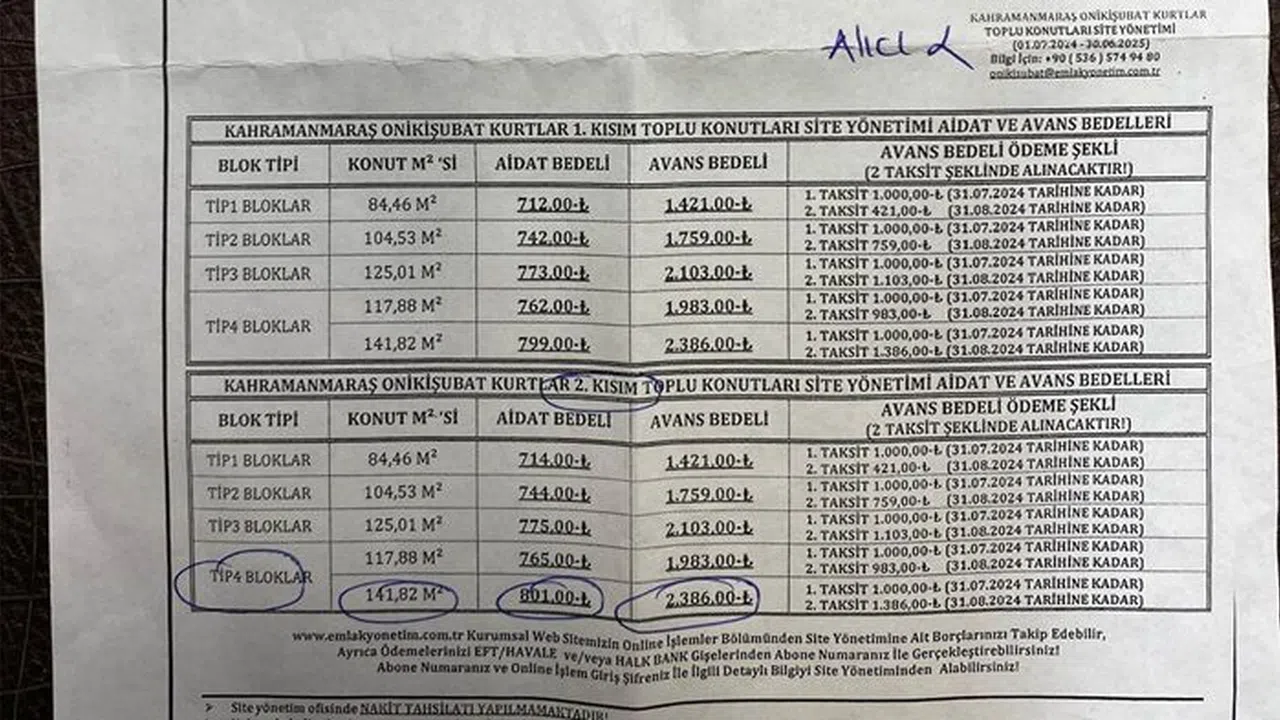 Elimize ulaşan Kurtlar TOKİ evlerinde 1. Kısım ve 2. Kısım olarak ayrıştırılan evlerde site yönetimi, aidat ve avans bedellerini evlerin metrekaresine göre ayrıştırmış durumda.