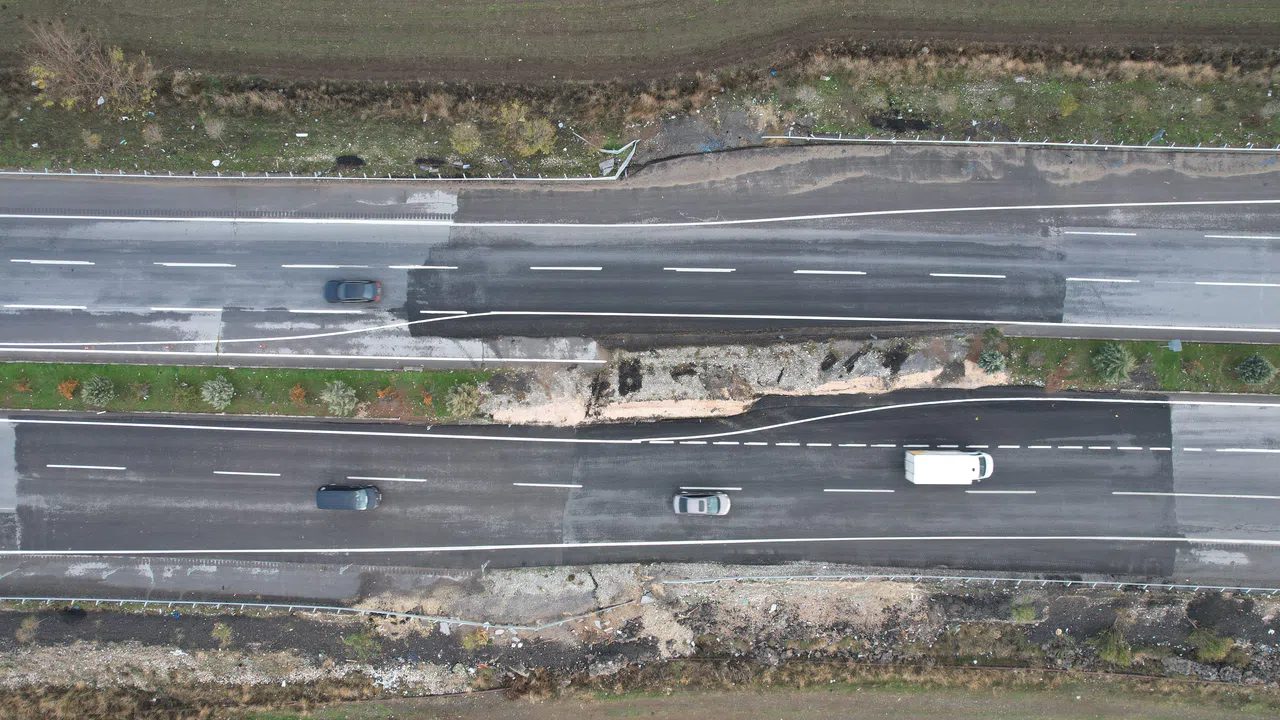 Karayolunun altından geçen fay, depremler sonrası yaklaşık 7 metrelik kaydı. Karayolunda seyreden bir araç sol şeritten devam ederken, fay hattının geçtiği noktada bir anda orta şeritte seyretmek zorunda kalıyor. Karayolu, hem araç içi kamera hem de dron ile görüntülendi.