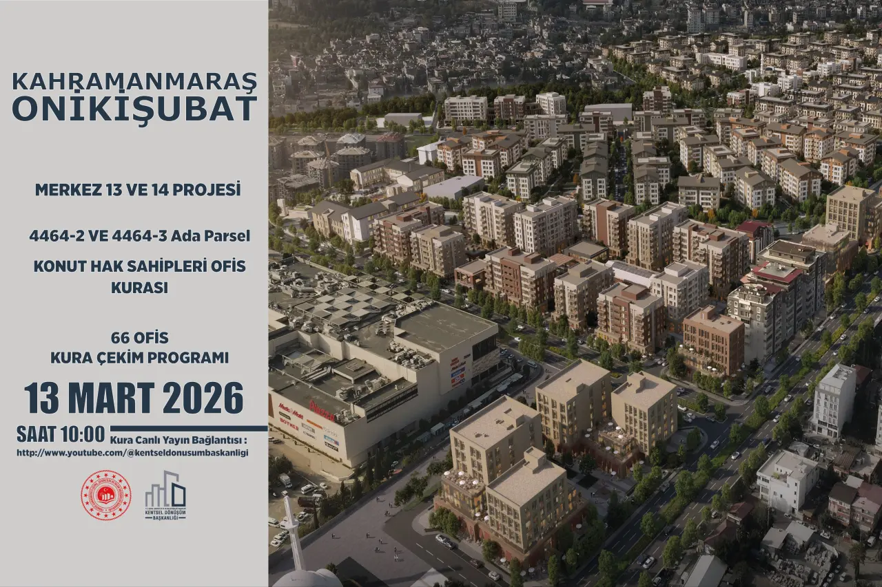 Kahramanmaraş’ta deprem sonrası başlatılan kentsel dönüşüm çalışmalarında yeni bir aşamaya daha geçildi. Onikişubat ilçesinde yürütülen Merkez 13 ve Merkez 14 projeleri kapsamında inşa edilen ticari alanlar için hak sahiplerini belirleyecek ofis kura çekimi bugün gerçekleştirilecek. Kentsel Dönüşüm Başkanlığı tarafından yapılan açıklamaya göre, 13 Mart 2026 Cuma günü saat 10.00’da yapılacak kura çekimiyle birlikte projede yer alan toplam 66 ofisin hangi hak sahiplerine verileceği belirlenecek. Kura çekimi süreci hem hak sahipleri hem de kamuoyu tarafından takip edilebilecek şekilde düzenlendi.
