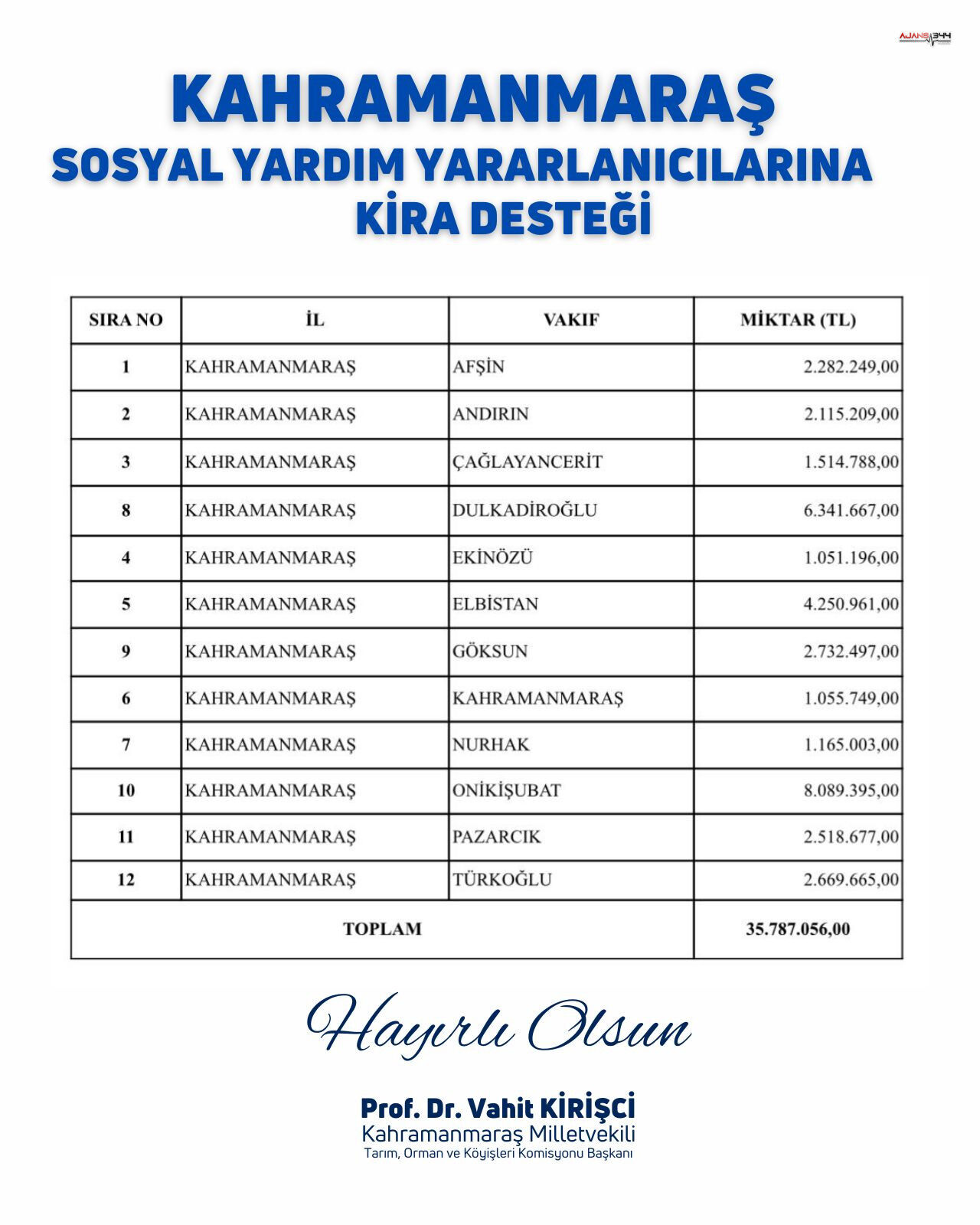 AK Parti Kahramanmaraş Milletvekili ve TBMM Tarım, Orman ve Köyişleri Komisyonu Başkanı Vahit Kirişçi, Kahramanmaraş merkez ve ilçelerini kapsayan önemli bir sosyal destek çalışmasını kamuoyuyla paylaştı. Sosyal yardım yararlanıcılarına yönelik kira desteği kapsamında, şehir genelinde toplam 35 milyon 787 bin 56 TL tutarında kaynağın aktarıldığını açıkladı.