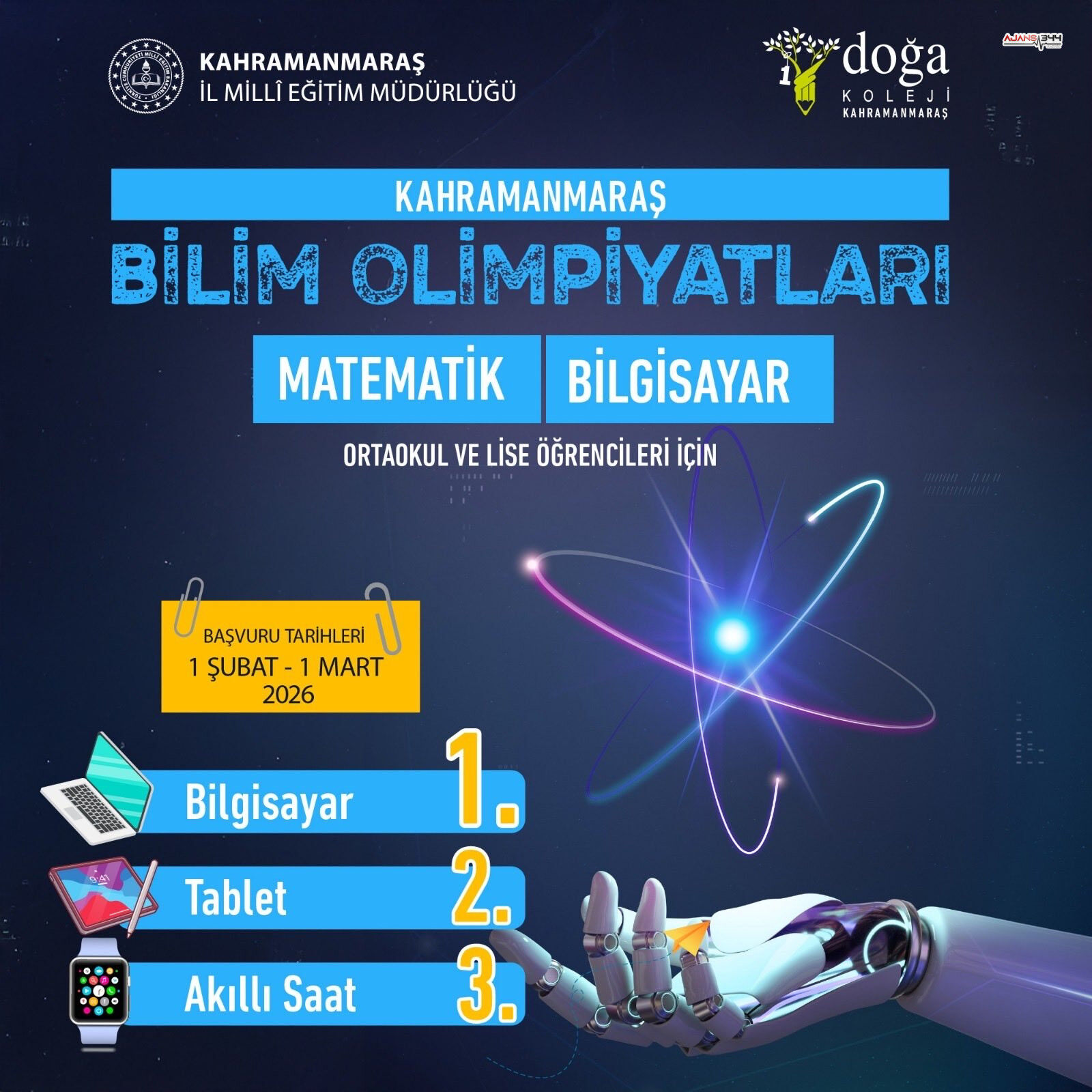 Kahramanmaraş Bilim Olimpiyatları iki ana alanda düzenlenecek. Matematik ve Bilgisayar. Yarışma süreci iki aşamadan oluşuyor. Birinci aşama, Mart 2026’da yapılacak çevrim içi sınav ile gerçekleştirilecek. Bu aşamayı başarıyla geçen öğrenciler, 11 Nisan 2026’da Kahramanmaraş’ta yapılacak yüz yüze finale katılma hakkı kazanacak.