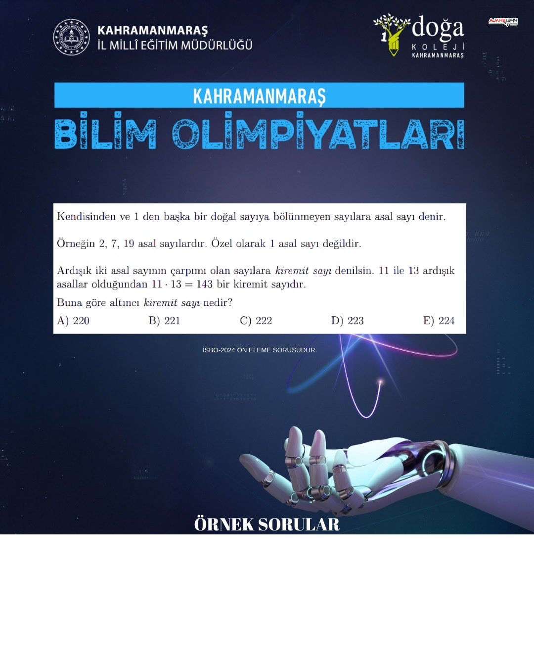 Kahramanmanmaraş'ta bilime ilgi duyan, matematik ve bilgisayar alanlarında kendini geliştirmek isteyen öğrenciler için önemli bir organizasyon hayata geçirilecek. Kahramanmaraş İl Millî Eğitim Müdürlüğü tarafından düzenlenen Kahramanmaraş Bilim Olimpiyatları 2025–2026, ortaokul ve lise öğrencilerini bilimsel düşüncenin merkezine taşıyacak. Öğrencilerin analitik düşünme, problem çözme ve üst düzey bilişsel becerilerini ortaya koymalarını amaçlıyor.