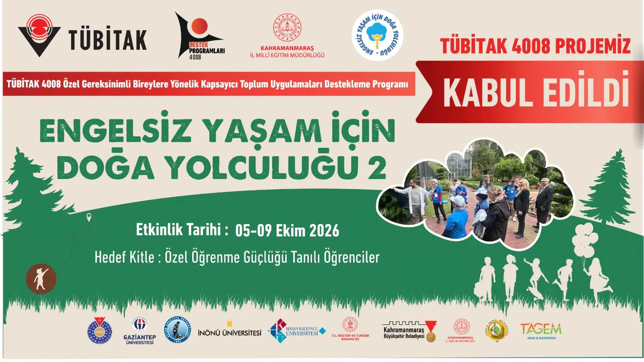 Kahramanmaraş İl Millî Eğitim Müdürlüğü tarafından hazırlanan “Engelsiz Yaşam İçin Doğa Yolculuğu-2” projesi, TÜBİTAK tarafından desteklenmeye değer bulundu. Özel gereksinimli öğrenciler için hazırlanan proje, bilimsel temelli eğitim uygulamalarıyla dikkat çekti.