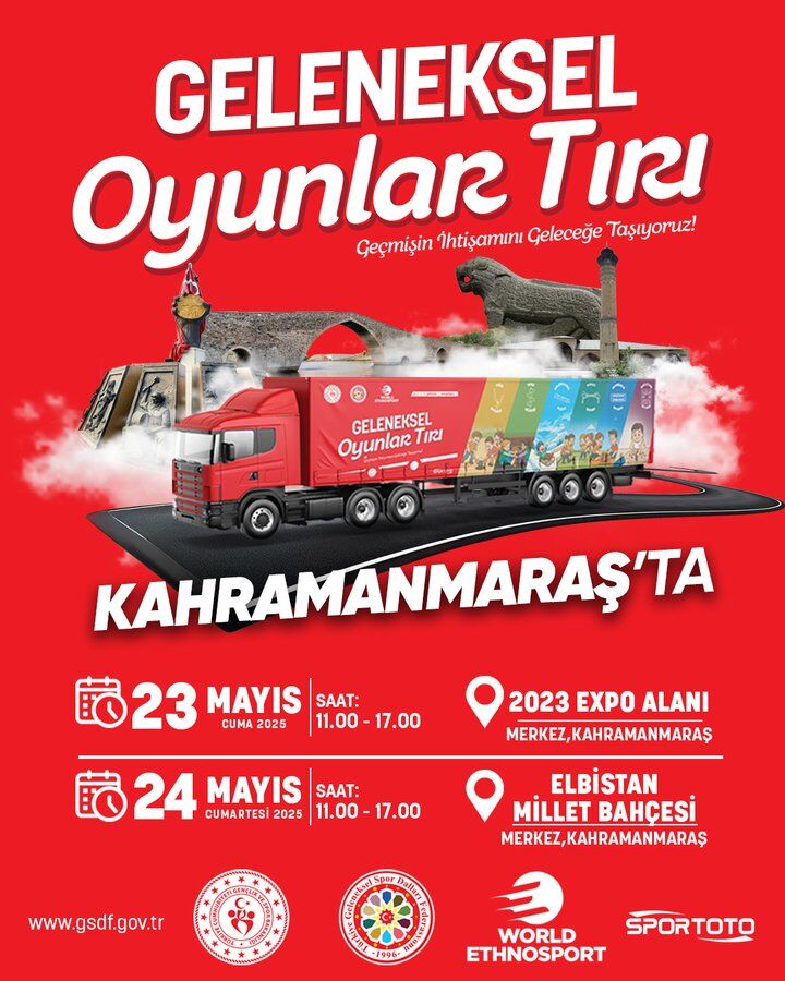 Kahramanmaraş Gençlik ve Spor İl Müdürlüğü tarafından yapılan açıklamaya göre, Geleneksel Oyunlar Tırı 23 Mayıs Cuma günü 2023 EXPO Alanı’nda, 24 Mayıs Cumartesi günü ise Elbistan Millet Bahçesi’nde çocuklara kapılarını açacak. Her iki etkinlik de saat 11.00 ile 17.00 arasında gerçekleştirilecek.