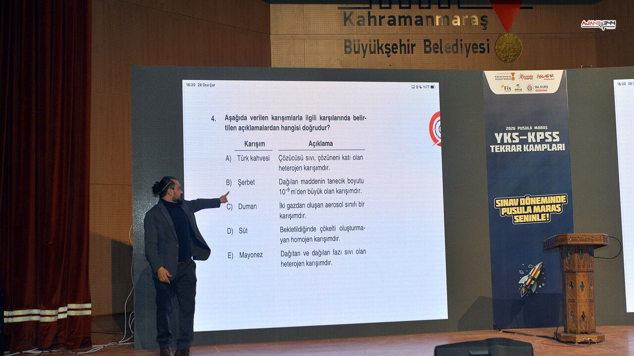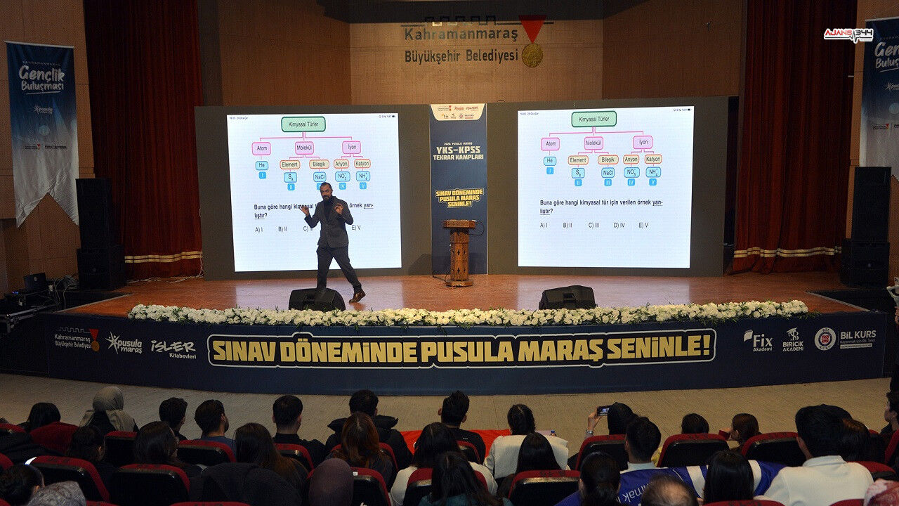 Kahramanmaraş Büyükşehir Belediyesi’nin üniversite sınavına hazırlanan gençlere yönelik düzenlediği YKS Kampı, üçüncü gününde yoğun ilgiyle devam etti. Mehmet Akif Ersoy Kültür Merkezi’nde gerçekleşen programda, öğrenciler Türkiye genelinde tanınan eğitimciler Yılmaz Kartal ve Mehmet Erdem ile buluştu. Fizik ve kimya derslerinde sınav taktikleri ve soru çözüm yöntemleri öğrencilerle paylaşıldı. Gençler, derslere aktif katılım sağlayarak birebir sorular sorma imkânı buldu.