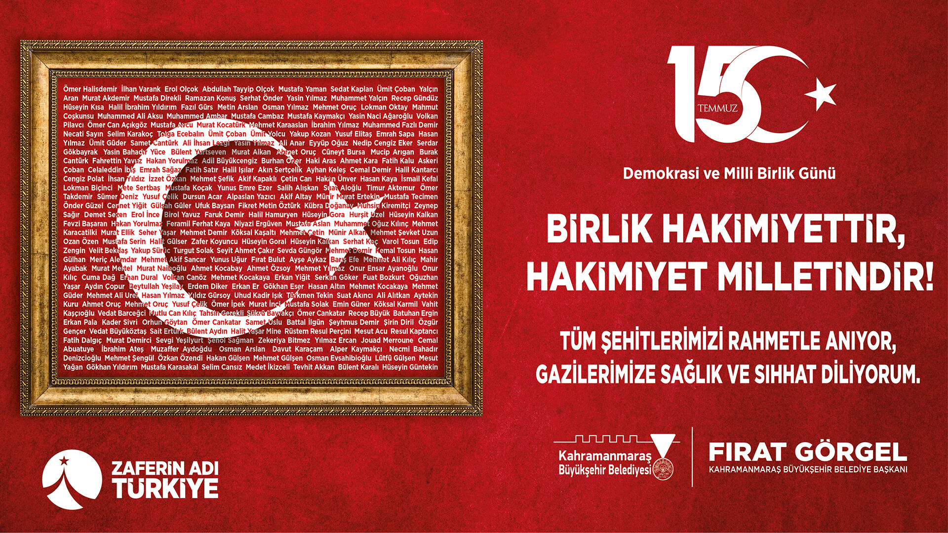 Kahramanmaraş Büyükşehir Belediye Başkanı Fırat Görgel, 15 Temmuz Demokrasi ve Milli Birlik Günü dolayısıyla bir mesaj yayımladı. Başkan Görgel mesajında, “Milletimizin iradesine, birlik ve beraberliğine kasteden hain darbe girişiminin üzerinden dokuz yıl geçti. 15 Temmuz 2016 gecesi, tarihimizin en karanlık sahnelerinden biriyle karşı karşıya kaldık. Ancak bu millet, tıpkı Çanakkale’de, Kurtuluş Savaşı’nda olduğu gibi, o gece de vatanına, bayrağına ve demokrasisine canı pahasına sahip çıktı. Cumhurbaşkanımız Sayın Recep Tayyip Erdoğan’ın kararlı duruşu ve aziz milletimizin sarsılmaz iradesiyle hain planlar bozulmuş, demokrasi bir kez daha galip gelmiştir. 15 Temmuz, sadece bir kalkışmanın bastırıldığı değil; aynı zamanda milletimizin istiklali ve istikbali uğruna destan yazdığı bir diriliş gecesidir” ifadelerini kullandı.