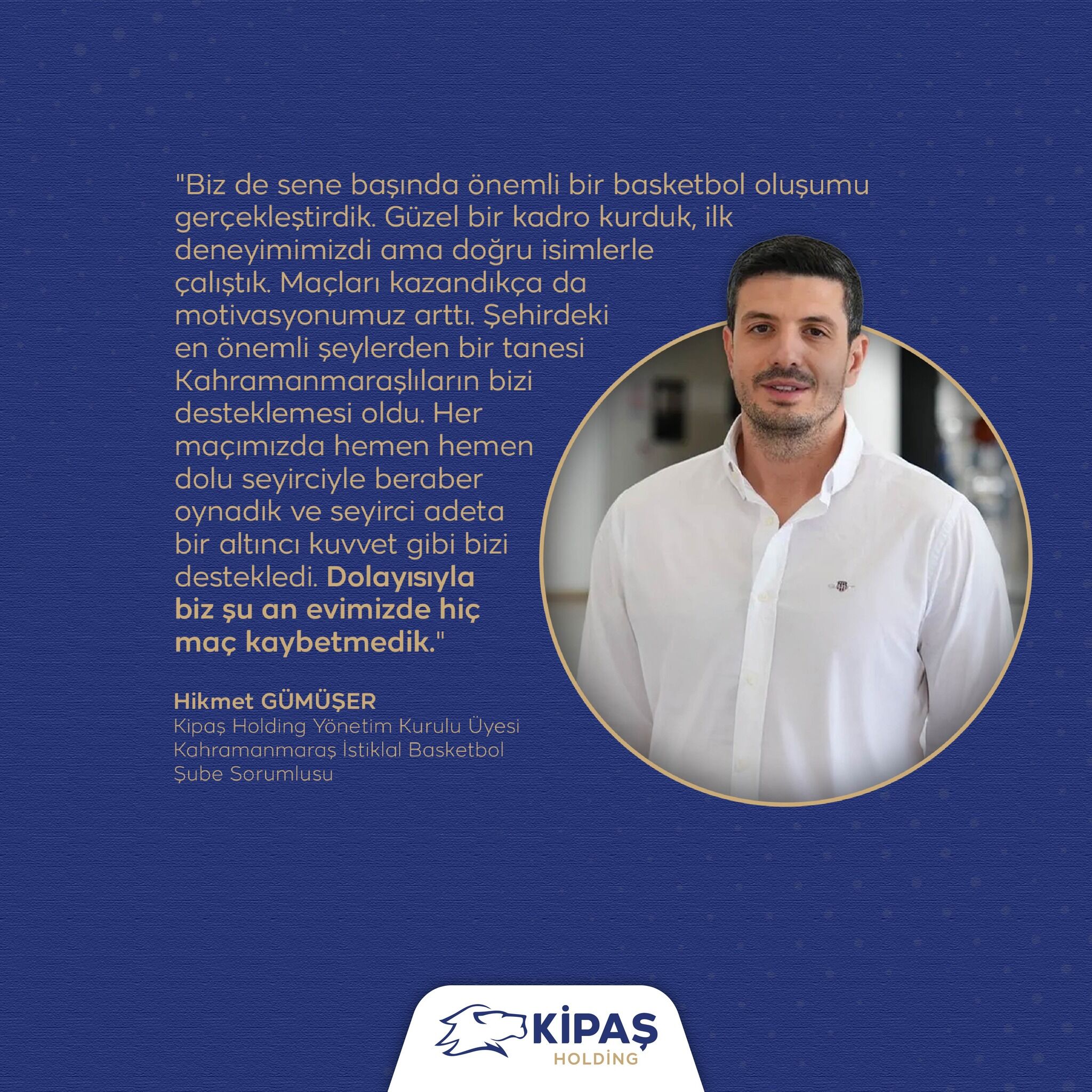 “Biz de sene başında önemli bir basketbol oluşumu gerçekleştirdik. Güzel bir kadro kurduk, ilk deneyimimizdi ama doğru isimlerle çalıştık. Maçları kazandıkça da motivasyonumuz arttı.” diyen Gümüşer, taraftarın desteğine de özellikle dikkat çekti.