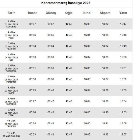 2025 yılına ait imsakiye takvimine göre, sahur ve iftar vakitleri her gün birkaç dakika değişerek ilerleyecek. İşte Kahramanmaraş’ta Ramazan boyunca sahur ve iftar saatleri...