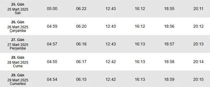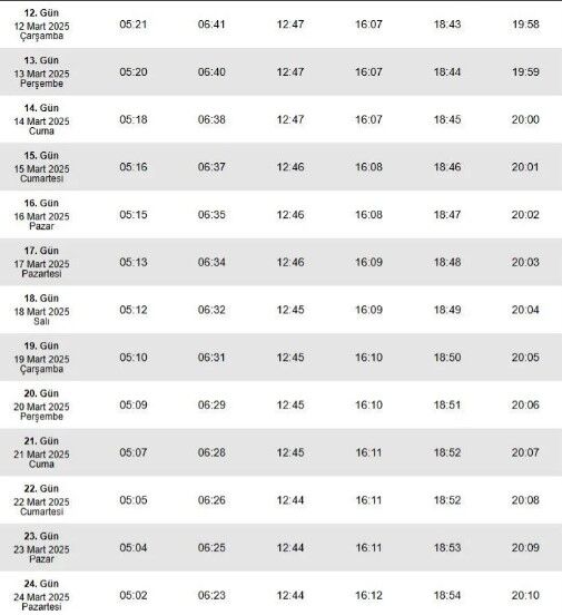 Ramazan ayı boyunca, sahur vakti her gün birkaç dakika erkene çekilecek, iftar saati ise yavaşça ilerleyecek. Ayın sonunda, 29 Mart’ta sahur vakti 04:54'e, iftar vakti ise 18:59'a kadar gerileyecek.