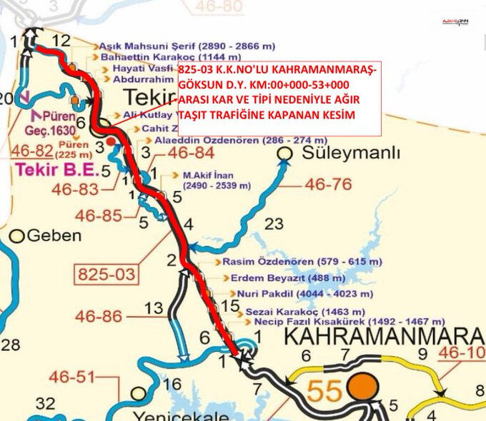 Kahramanmaraş-Göksun Yolu, gece saatlerinden itibaren etkili olan yoğun kar yağışı ve tipi nedeniyle 0-53. kilometreleri arasında ağır taşıt trafiğine kapatıldı. Karayolları Genel Müdürlüğü'nden yapılan açıklamada, yolun geçici olarak kapatıldığı ve karla mücadele çalışmalarının sürdüğü belirtildi.