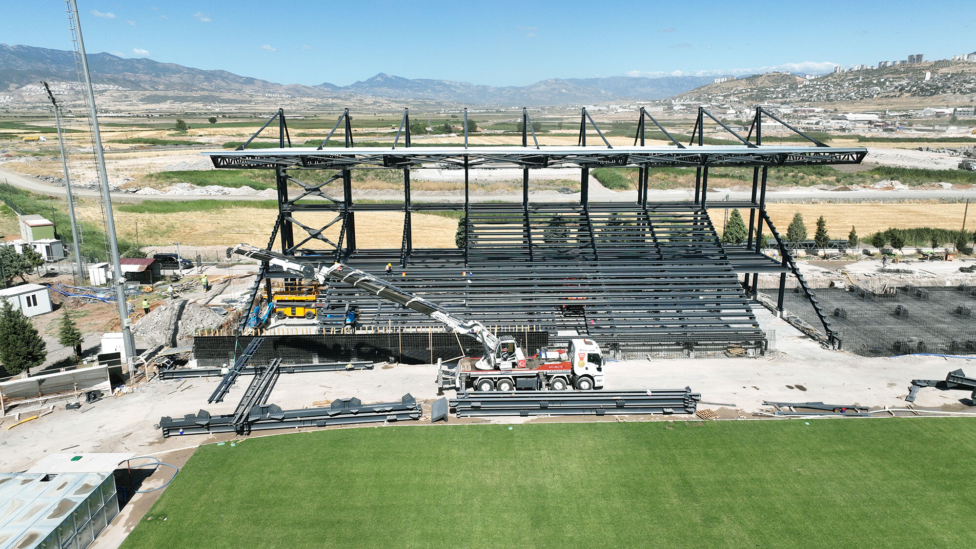 Modern mimarisi ve yüksek standartlara uygun yapısıyla dikkat çeken spor kompleksi, hem amatör hem de profesyonel futbol takımları için güçlü bir altyapı sunacak. Sahada çim ekimi tamamlanırken, tribün, soyunma odaları ve idari binaların inşası da yoğun bir tempoyla sürdürülüyor.