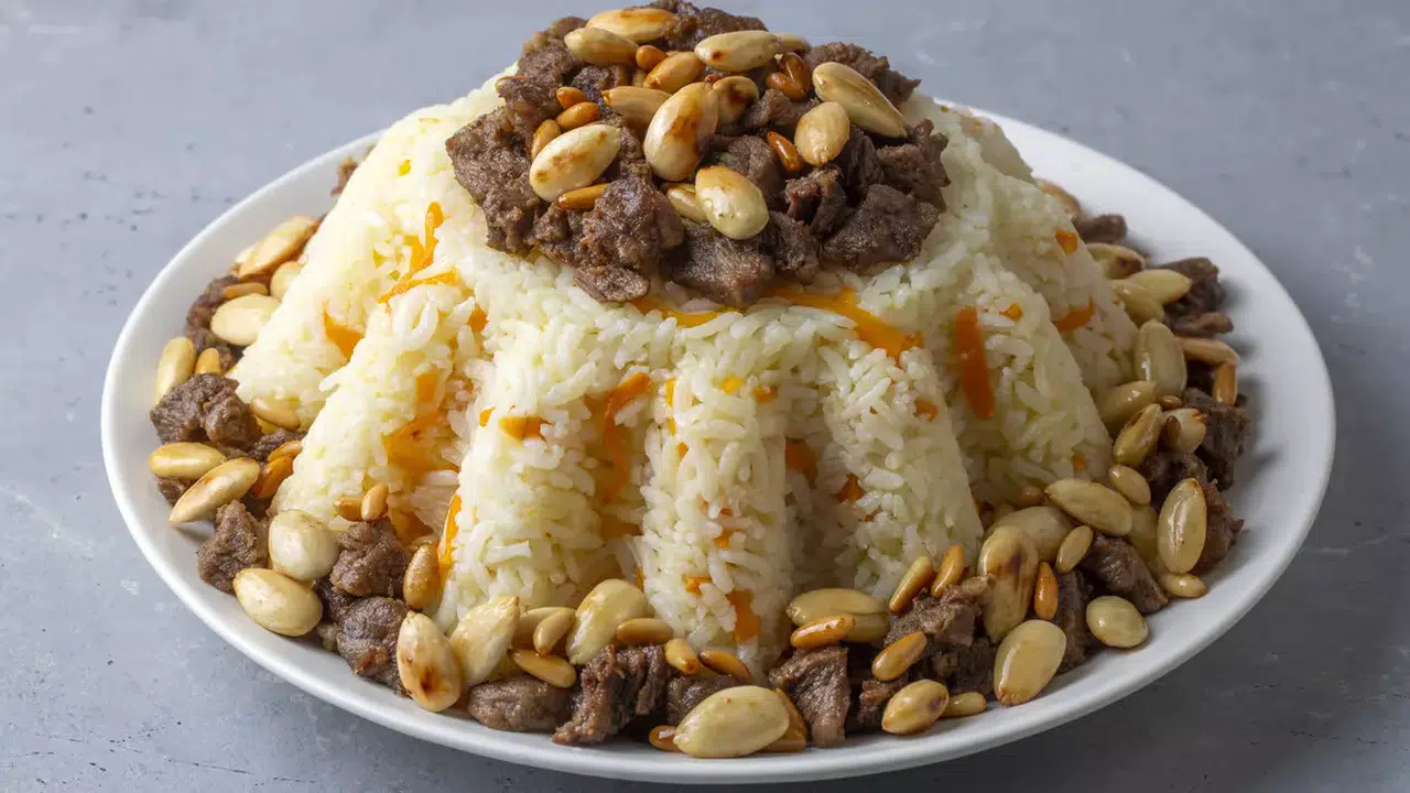 Pilav demlendikten sonra servis tabağına alın. Üzerine etleri ve kavrulmuş badem-fıstığı koyun.