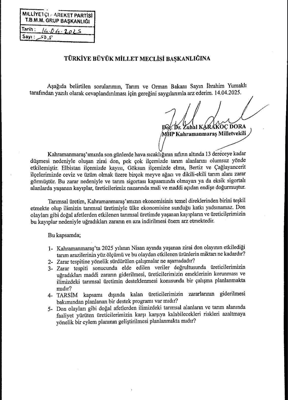 Milletvekili Karakoç Dora tarafından Tarım ve Orman Bakanı’na sunulan soru önergesinde şu sorulara yanıt talep edildi: