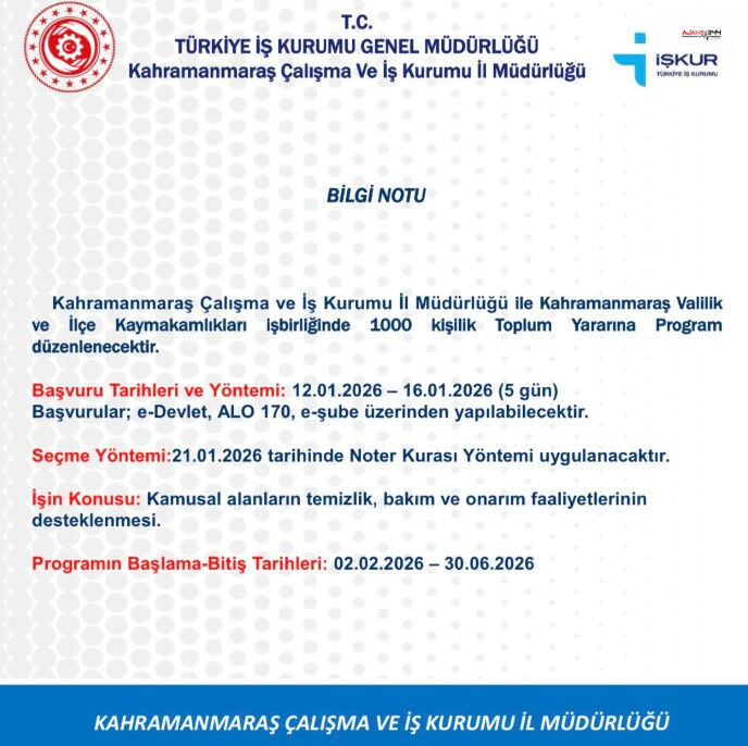 Kahramanmaraş’ta istihdama ve şehir düzenine doğrudan katkı sunacak olan Toplum Yararına Program için süreç başladı. Kahramanmaraş Çalışma ve İş Kurumu İl Müdürlüğü’nün, Valilik ve ilçe kaymakamlıklarıyla yürüttüğü çalışma kapsamında 1000 kişilik TYP personel alımı yapılacak.