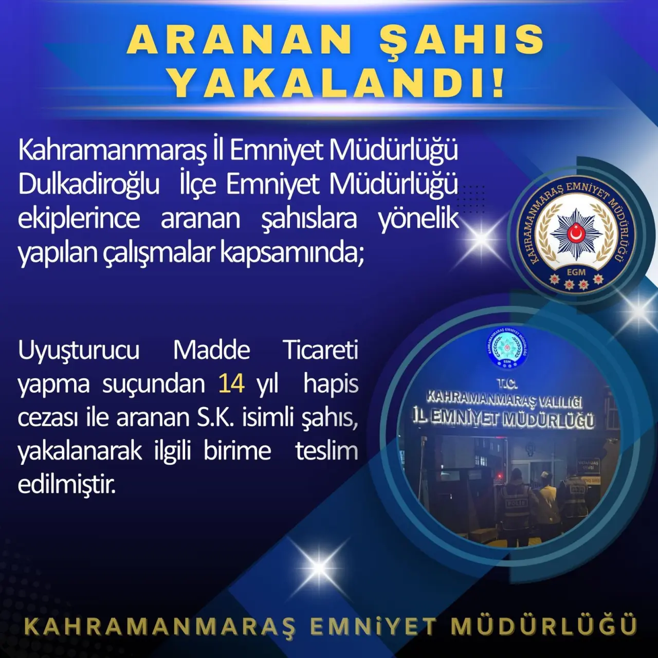 Kahramanmaraş İl Emniyet Müdürlüğü ve Dulkadiroğlu İlçe Emniyet Müdürlüğü ekiplerinin yürüttüğü titiz çalışmalar, şehre yönelik önemli bir suçluyu adaletle buluşturdu. Uyuşturucu madde ticareti yapma suçundan hakkında 14 yıl hapis cezası bulunan S.K. isimli şahıs, yapılan başarılı operasyon sonucunda yakalanarak, güvenlik birimlerine teslim edildi.