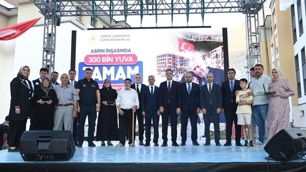 Çevre, Şehircilik ve İklim Değişikliği Bakanı Murat Kurum, törende yaptığı konuşmada çalışmaların hızla sürdüğünü belirterek, “Bugün Anka Kuşu gibi yeniden doğuyoruz. Sayın Cumhurbaşkanımızın katılımıyla 300 bininci evimizin anahtarlarını teslim ediyoruz. Baharı müjdeleyen 300 bin çiçek daha açıyor. Depremzedeler için ne yapıyorsak, gönülden yapıyoruz. Yıl sonuna kadar evine kavuşmayan tek bir kardeşimizi bırakmayacağız” dedi.