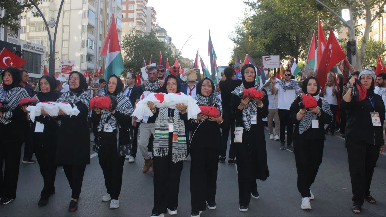 Katılımcılar, yürüyüş boyunca ellerinde dövizlerle barış ve adalet çağrısı yaptı, sık sık tekbir getirerek Filistin halkı için dua etti.