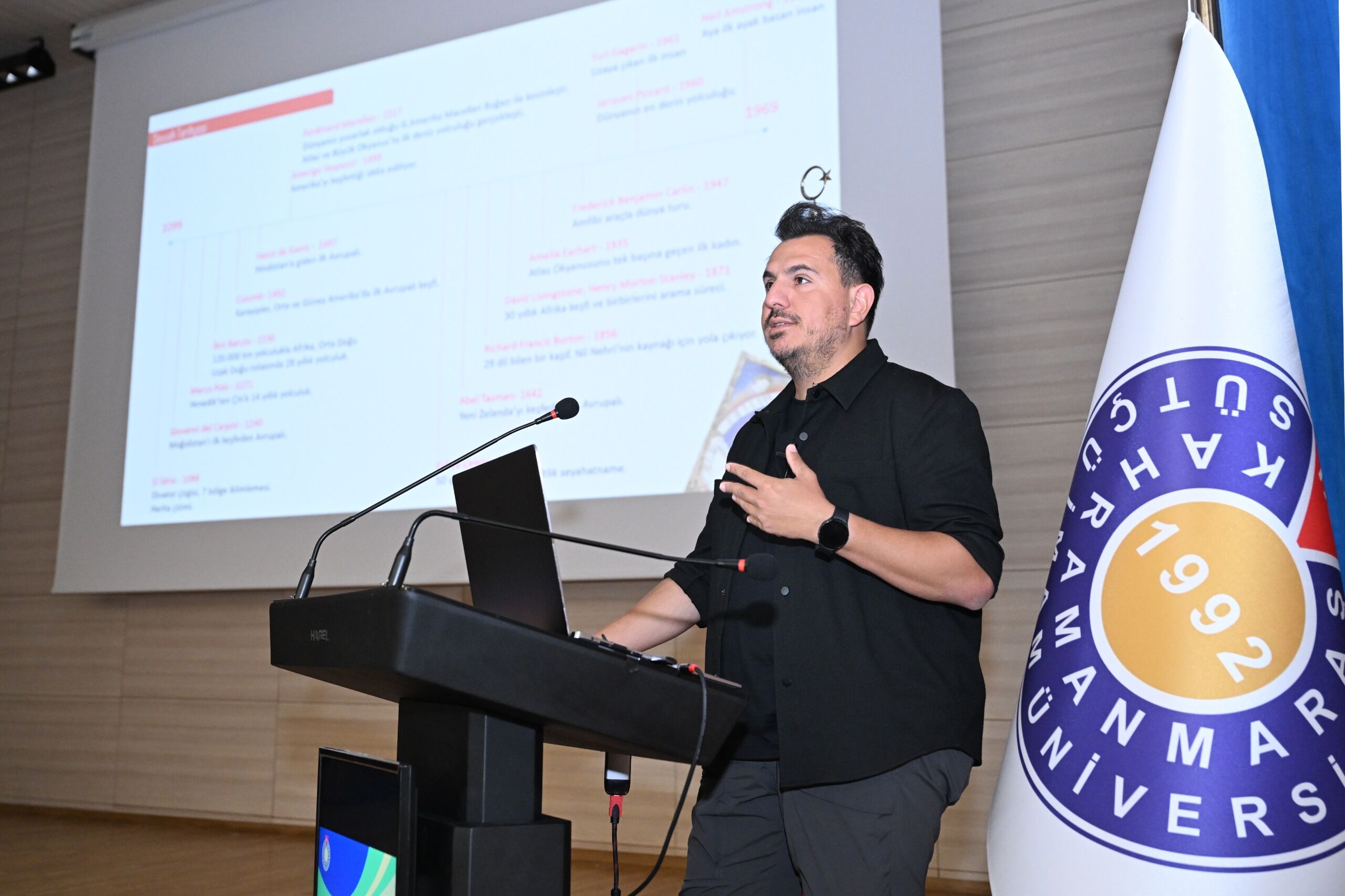 Sunumunun devamında tarihî keşif yolculuklarına değinen Bozaslan, insanın yaşadığı bölgenin ötesini merak ederek kıtaları, okyanusları ve bilinmeyen coğrafyaları tanıma arzusunun hiç eksilmediğini söyledi. Kristof Kolomb’un Amerika keşfi, İspanyol ve Portekizli denizcilerin Maya uygarlığına dair yolculukları, 1871 Tanzanya keşfi, 1908 Kuzey Kutbu ve 1911’de Güney Kutbu keşifleri ile Frederic Benjamin’in 1957’deki dünya turu gibi önemli tarihî kesitleri hatırlattı. Eski dünya haritaları eşliğinde yaptığı sunum, katılımcılara zamansız bir keşif hissi yaşattı.