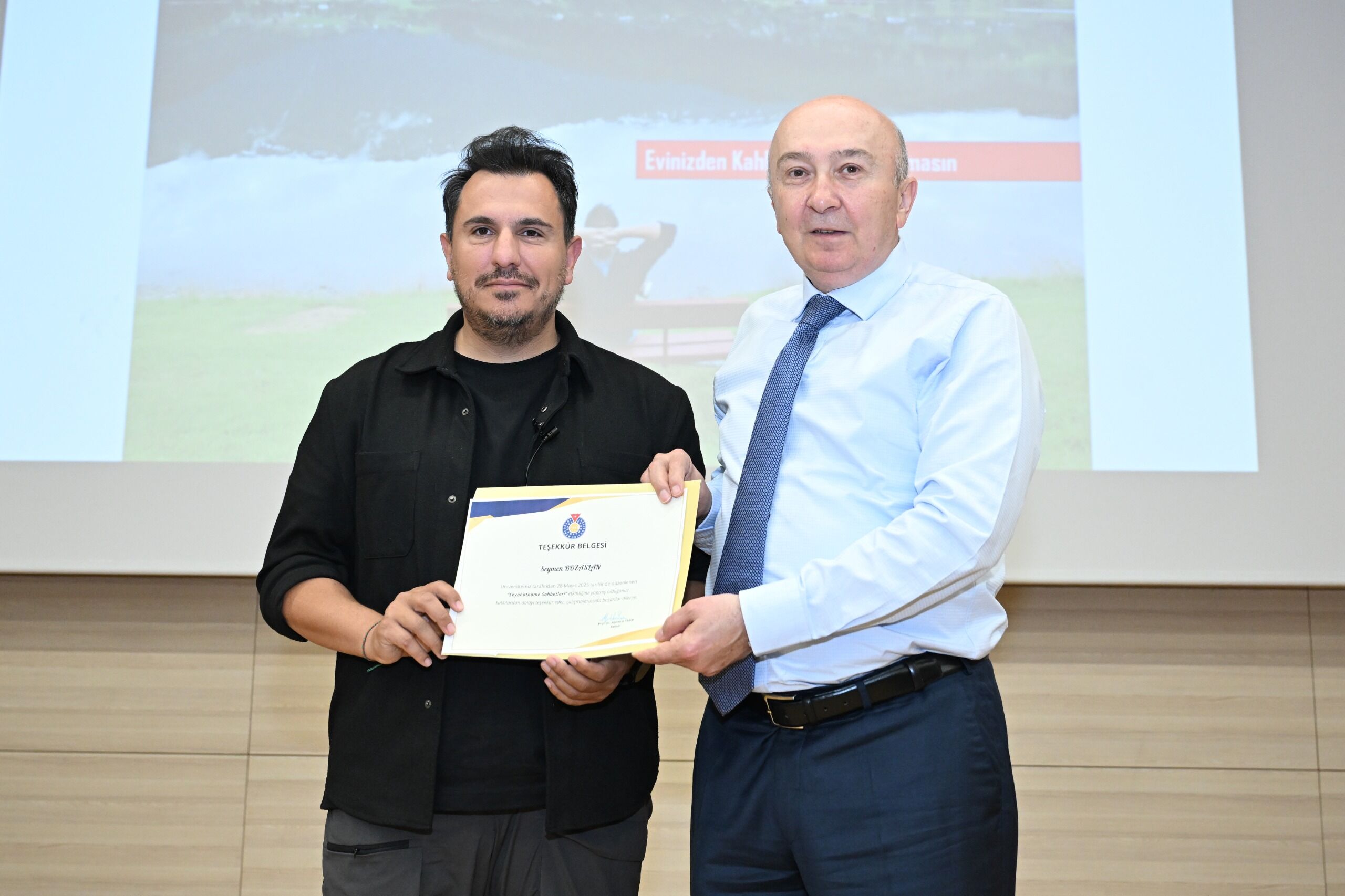Etkinliğin sonunda Seymen Bozaslan’a, katkılarından dolayı KSÜ Rektörlüğü tarafından bir teşekkür belgesi takdim edildi. Törende söz alan Rektör Prof. Dr. Alptekin Yasım, Bozaslan’ın sadece bir gezgin değil, aynı zamanda tarihî ve kültürel değerlerimizi belgeleyen bir hafıza işçisi olduğunu vurguladı. Bozaslan’ın objektifinden yansıyan karelerin Kahramanmaraş’ın tanıtımına doğrudan katkı sunduğunu belirten Yasım, kentin doğal, tarihî ve kültürel zenginliklerinin dünyaya duyurulmasında gösterdiği özveri için teşekkür etti. Seymen Bozaslan’ın şehirlerin ruhunu yansıtan yaklaşımıyla, turizmde nitelikli anlatıya büyük katkı sağladığını ifade etti.