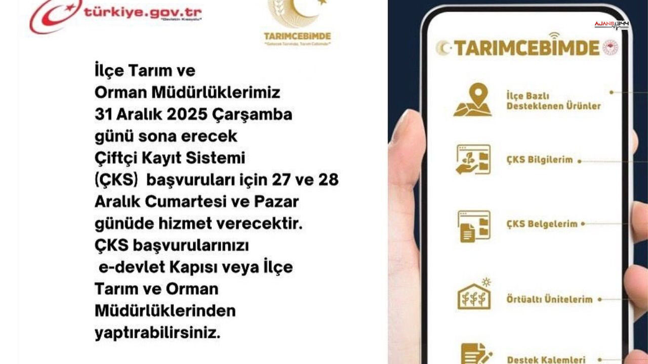 Kahramanmaraş İl Tarım ve Orman Müdürlüğü, Çiftçi Kayıt Sistemi (ÇKS) başvurularının son günü olarak 31 Aralık 2025’i belirledi. Çiftçilerin mağduriyet yaşamaması adına, İlçe Tarım ve Orman Müdürlükleri, 27-28 Aralık Cumartesi ve Pazar günlerinde de hizmet vermeye devam edecekleri duyruldu.