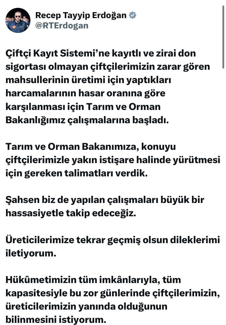 Sosyal medya hesabı üzerinden paylaşımda bulunan Cumhurbaşkanı Erdoğan, Tarım ve Orman Bakanlığının, Çiftçi Kayıt Sistemi’ne kayıtlı ancak zirai don sigortası olmayan üreticilerin zararlarının karşılanması için harekete geçtiğini belirtti.