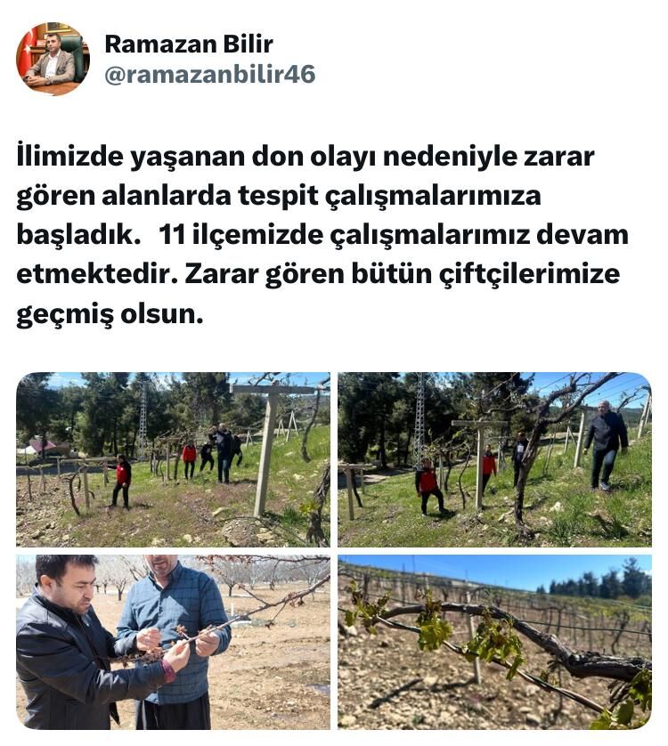 Kahramanmaraş İl Tarım ve Orman Müdürü Ramazan Bilir ise sosyal medya üzerinden yaptığı açıklamada, 11 ilçede hasar tespit çalışmalarının sürdüğünü bildirdi. “İlimizde yaşanan don olayı nedeniyle zarar gören alanlarda tespit çalışmalarımıza başladık. Zarar gören bütün çiftçilerimize geçmiş olsun” ifadelerini kullanan Bilir, çalışmaların en kısa sürede tamamlanarak ilgili desteklerin sağlanacağını belirtti.