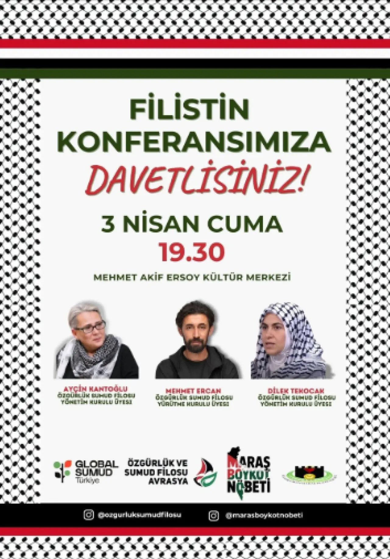 Kahramanmaraş Platformu koordinesinde Mehmet Akif Ersoy Kültür Merkezi’nde düzenlenen Filistin Konferansı, geniş katılımla gerçekleştirildi. Özgürlük ve Sumud Filosu Avrasya yönetim kurulu üyelerinin katılımıyla gerçekleşen program, vatandaşlardan yoğun ilgi gördü.