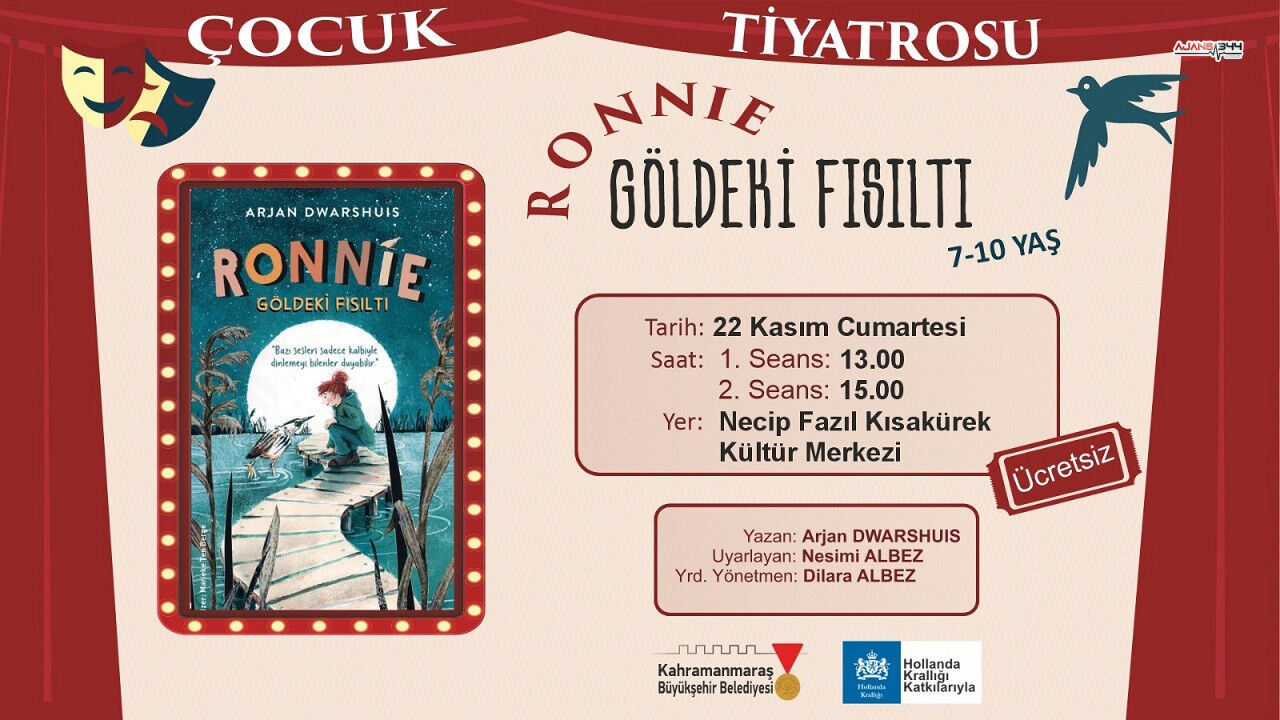Kahramanmaraş Büyükşehir Belediyesi, kültür-sanat etkinlikleri kapsamında çocuklara özel ücretsiz bir tiyatro oyununu daha şehre kazandırıyor. Büyükşehir Belediyesi ve Hollanda Büyükelçiliği iş birliğiyle düzenlenen “Ronnie – Göldeki Fısıltı” adlı tiyatro gösterisi, 22 Kasım Cumartesi günü Necip Fazıl Kısakürek Kültür Merkezi’nde minik izleyicilerle buluşacak.