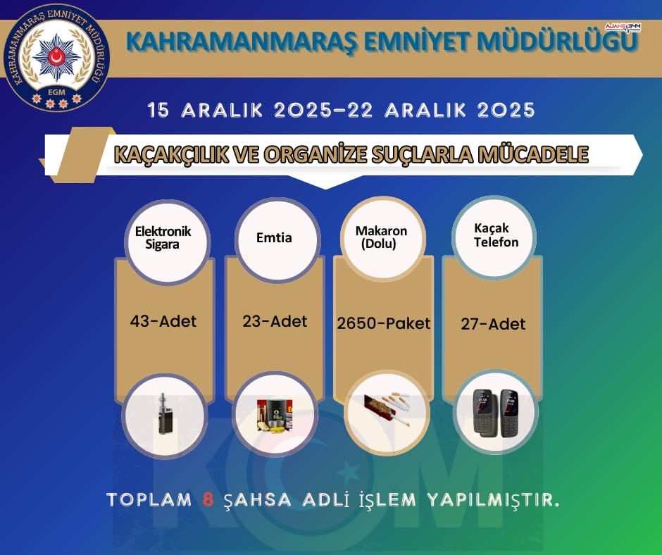 Kahramanmaraş Emniyet birimlerinin paylaştığı bilançoya göre, yapılan çalışmalar sırasında kaçak ürünlerin tespitine odaklanıldı. Uygulamalar kapsamında 43 adet elektronik sigara ele geçirildi. Piyasa değeri yüksek olduğu belirtilen bu ürünlerin yasa dışı yollarla temin edildiği değerlendirildi. Bunun yanı sıra 23 adet çeşitli emtia da güvenlik güçlerince muhafaza altına alındı.