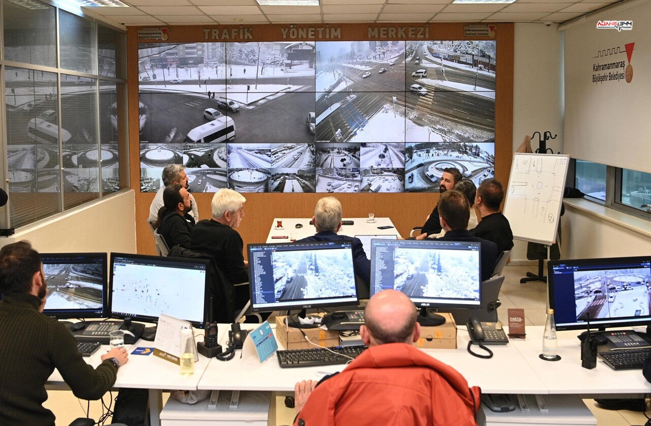 Kahramanmaraş genelinde etkili olan yoğun kar yağışı sonrası Büyükşehir Belediyesi tüm birimleriyle teyakkuza geçti. Özellikle ulaşımın aksamaması, vatandaşların günlük yaşamının olumsuz etkilenmemesi adına kar küreme, tuzlama ve solüsyon çalışmaları aralıksız sürdürülüyor. Bu kapsamda Büyükşehir Belediye Başkanı Fırat Görgel de Trafik Yönetim Merkezi’ni ziyaret ederek şehir genelindeki yol durumunu anlık olarak inceledi. 264 kamera ile donatılmış sistem üzerinden merkez ve 11 ilçedeki kritik güzergâhlar canlı olarak takip edildi.