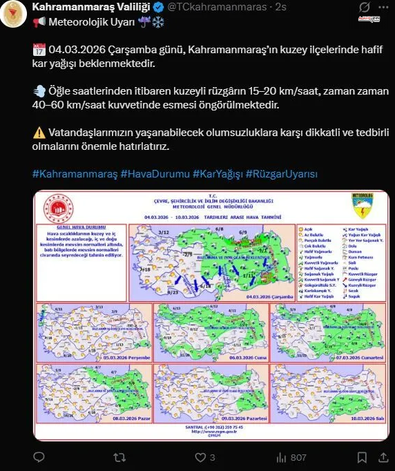 Kahramanmaraş Valiliği, 4 Mart 2026 Çarşamba günü için meteorolojik uyarıda bulundu. Yapılan açıklamada, kentin özellikle kuzey ilçelerinde hafif kar yağışının beklendiği bildirildi.