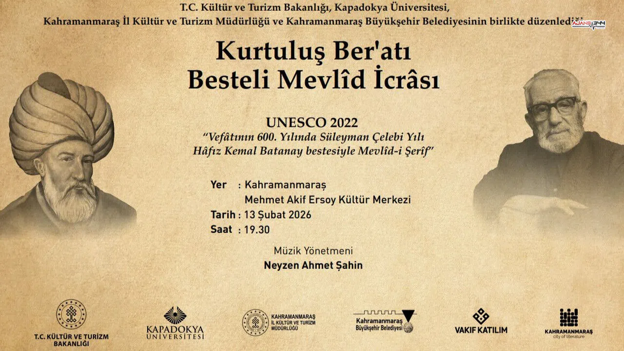 “Kurtuluş ber’atı besteli mevlid icrası” programı, 13 Şubat Cuma günü saat 19.30’da Mehmet Akif Ersoy Kültür Merkezi’nde başlayacak. Program, Kahramanmaraş Büyükşehir Belediyesi’nin ev sahipliğinde ve Kültür ve Turizm Bakanlığı’nın katkılarıyla düzenleniyor. Akademik ve kültürel kurumların ortaklığıyla hayata geçirilen etkinlik, şehrin kurtuluş yıldönümüne özel olarak planlandı.