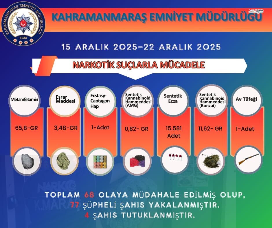 Kahramanmaraş Emniyet birimlerinin paylaştığı haftalık listede toplam 68 ayrı olaya müdahale edildi. Yürütülen çalışmalar sonucunda 77 şüpheli yakalandı. Gözaltına alınan kişiler hakkında adli işlemler tamamlandı ve bunlardan 4’ü çıkarıldıkları mahkemece tutuklandı. Operasyonlar sırasında farklı tür ve miktarlarda uyuşturucu madde ele geçirildi. Ele geçirilen maddeler arasında 65,8 gram metamfetamin, 3,48 gram esrar maddesi, 1 adet ecstasy captagon hap, 0,82 gram sentetik kannabinoid hammaddesi ve 11,62 gram bonzai olarak bilinen sentetik kannabinoid yer aldı. Ayrıca uyuşturucu ticaretinde kullanıldığı değerlendirilen 15 bin 581 adet sentetik ecza da güvenlik güçlerince muhafaza altına alındı.