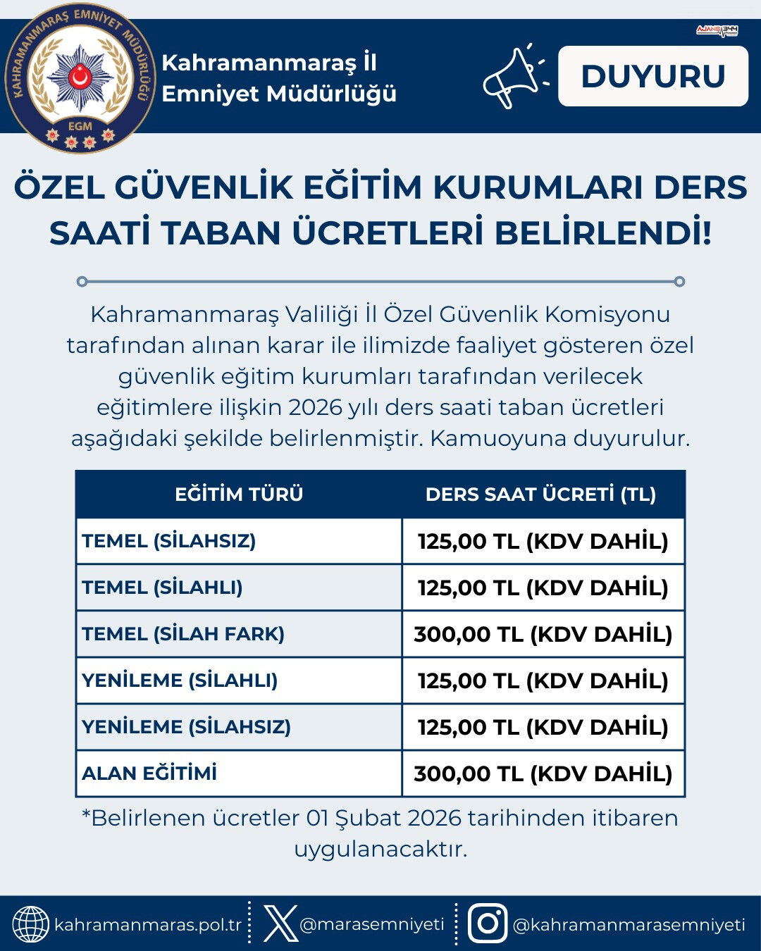 Belirlenen 2026 yılı özel güvenlik eğitim ders saati ücretleri açık şekilde şu şekilde duyuruldu: