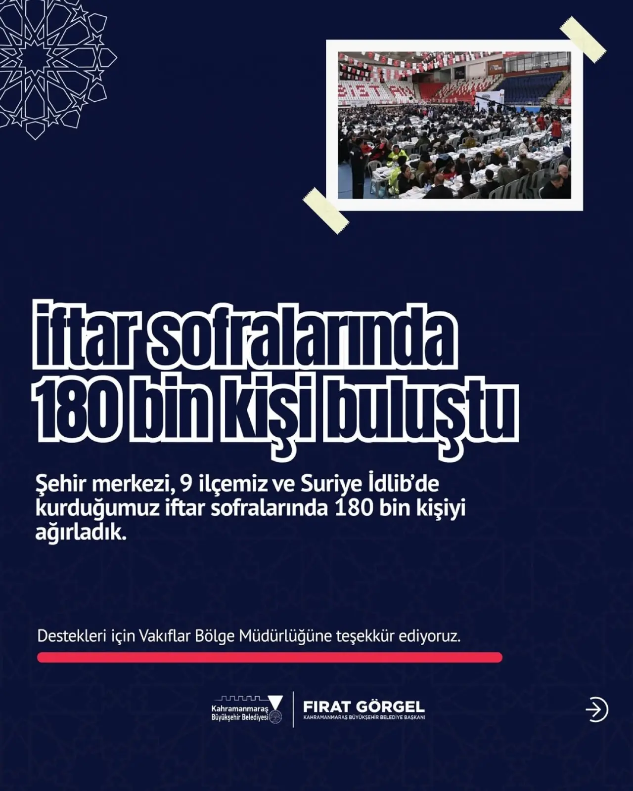 Ramazan ayı boyunca şehir merkezi ve 9 ilçede kurulan iftar sofralarında toplam 180 bin vatandaşın ağırlandığı bildirildi. Kurulan sofraların yalnızca bir yemek organizasyonu olmadığı, aynı zamanda toplumsal dayanışmanın güçlü bir göstergesi olduğu vurgulandı. Dayanışma faaliyetlerinin şehir sınırlarını aşarak Suriye’nin İdlib bölgesine kadar ulaştığı ifade edildi.