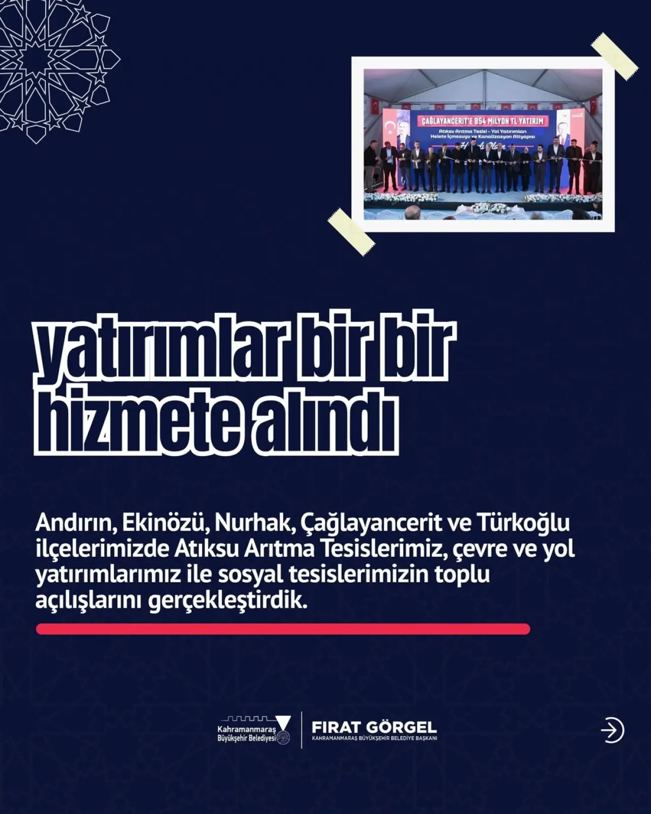 Ramazan ayı içerisinde yalnızca sosyal faaliyetler değil, altyapı ve üstyapı yatırımları da hayata geçirildi. Andırın, Ekinözü, Nurhak, Türkoğlu ve Çağlayancerit ilçelerinde atıksu arıtma tesisleri, yol ve çevre düzenlemeleri ile sosyal tesislerin toplu açılışlarının yapıldığı bildirildi.