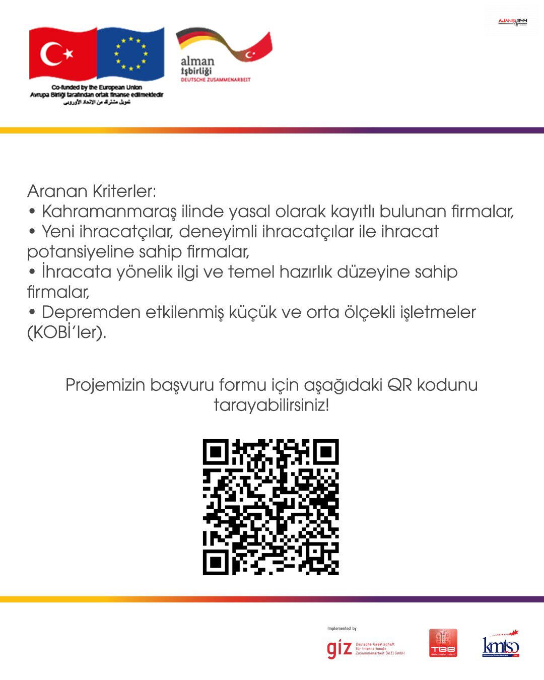 Programa, Kahramanmaraş’ta yasal olarak kayıtlı bulunan, ihracata ilgi duyan ya da ihracat potansiyeline sahip, depremden etkilenmiş küçük ve orta ölçekli işletmeler başvurabiliyor. Yetkililer, başvuruların proje kapsamında belirlenen kriterlere göre değerlendirileceğini bildirdi.