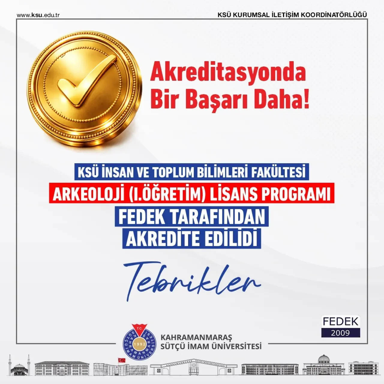 Kahramanmaraş Sütçü İmam Üniversitesi (KSÜ) Arkeoloji Bölümü, kalite odaklı akademik çalışmalarının bir sonucu olarak önemli bir akreditasyon sürecini başarıyla tamamladı. Fen, Edebiyat, Fen-Edebiyat, Dil ve Tarih-Coğrafya Fakülteleri Öğretim Programları Değerlendirme ve Akreditasyon Derneği (FEDEK) tarafından, 16 Mart 2026 ile 30 Eylül 2028 tarihleri arasında geçerli olacak şekilde akreditasyon alındı.