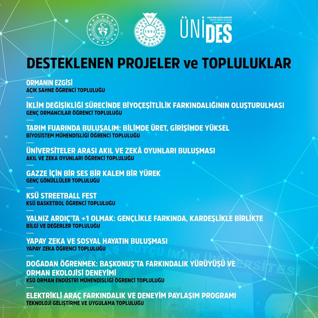 Kahramanmaraş Sütçü İmam Üniversitesi (KSÜ) öğrencileri, Gençlik ve Spor Bakanlığı’nın desteklediği Üniversite Öğrenci Toplulukları İş Birliği ve Destek Programı (ÜNİDES)’te önemli bir başarıya imza attı. ÜNİDES’in 5. döneminde yapılan değerlendirmeler sonucunda KSÜ bünyesindeki 10 öğrenci topluluğu projesi, resmi destek almaya hak kazandı.