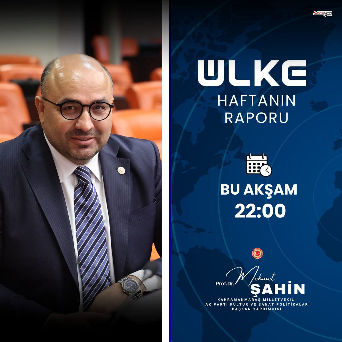 Kahramanmaraş Milletvekili Prof. Dr. Mehmet Şahin, bu akşam ekranlara gelecek. Ülke TV'nin canlı yayın programına konuk olacak olan Şahin, saat 22.00'de izleyicilerle buluşacak.