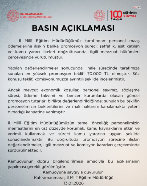 Yapılan açıklamada, tekliflerin beklentileri karşılamadığı ve sürecin bu nedenle devam ettiği açık bir dille ifade edilerek şu ifadelere yer verildi: İl Millî Eğitim Müdürlüğümüz tarafından personel maaş ödemelerine ilişkin banka promosyon süreci; şeffaflık, eşit katılım ve kamu yararı ilkeleri doğrultusunda, ilgili mevzuat hükümleri çerçevesinde yürütülmüştür.