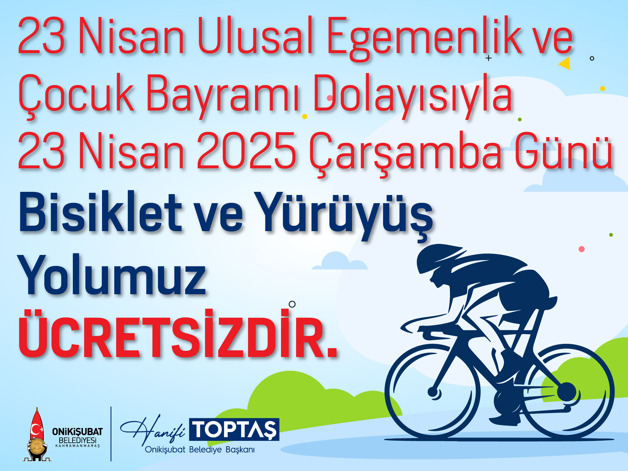 Onikişubat Belediyesi, 23 Nisan Ulusal Egemenlik ve Çocuk Bayramı dolayısıyla düzenleyeceği Çocuk Şenliği’ne ek olarak Bisiklet ve Yürüyüş Yolu’nu da bir günlüğüne ücretsiz hale getirdi.