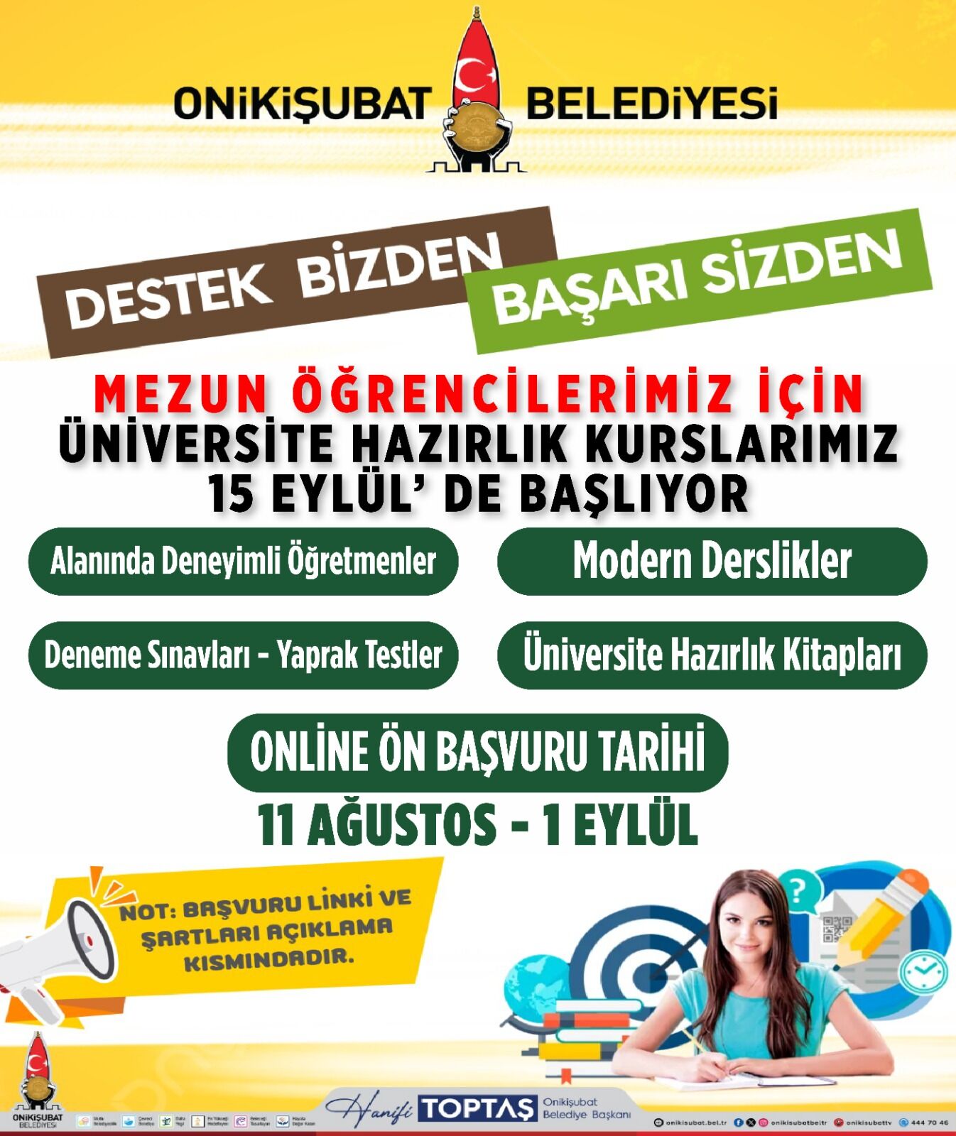‘Destek Bizden, Başarı Sizden’ sloganıyla yola çıkan Hanifi Toptaş başkanlığındaki Onikişubat Belediyesi, öğrencilerin sınav sürecinde ihtiyaç duyduğu her detayı düşünerek, güçlü bir kurs programı hazırladı. Alanında deneyimli öğretmenlerin görev alacağı kurslarda, modern dersliklerde eğitim verilecek. Ayrıca, öğrencilere deneme sınavları, yaprak testler ve üniversite hazırlık kitapları ücretsiz olarak sağlanacak.