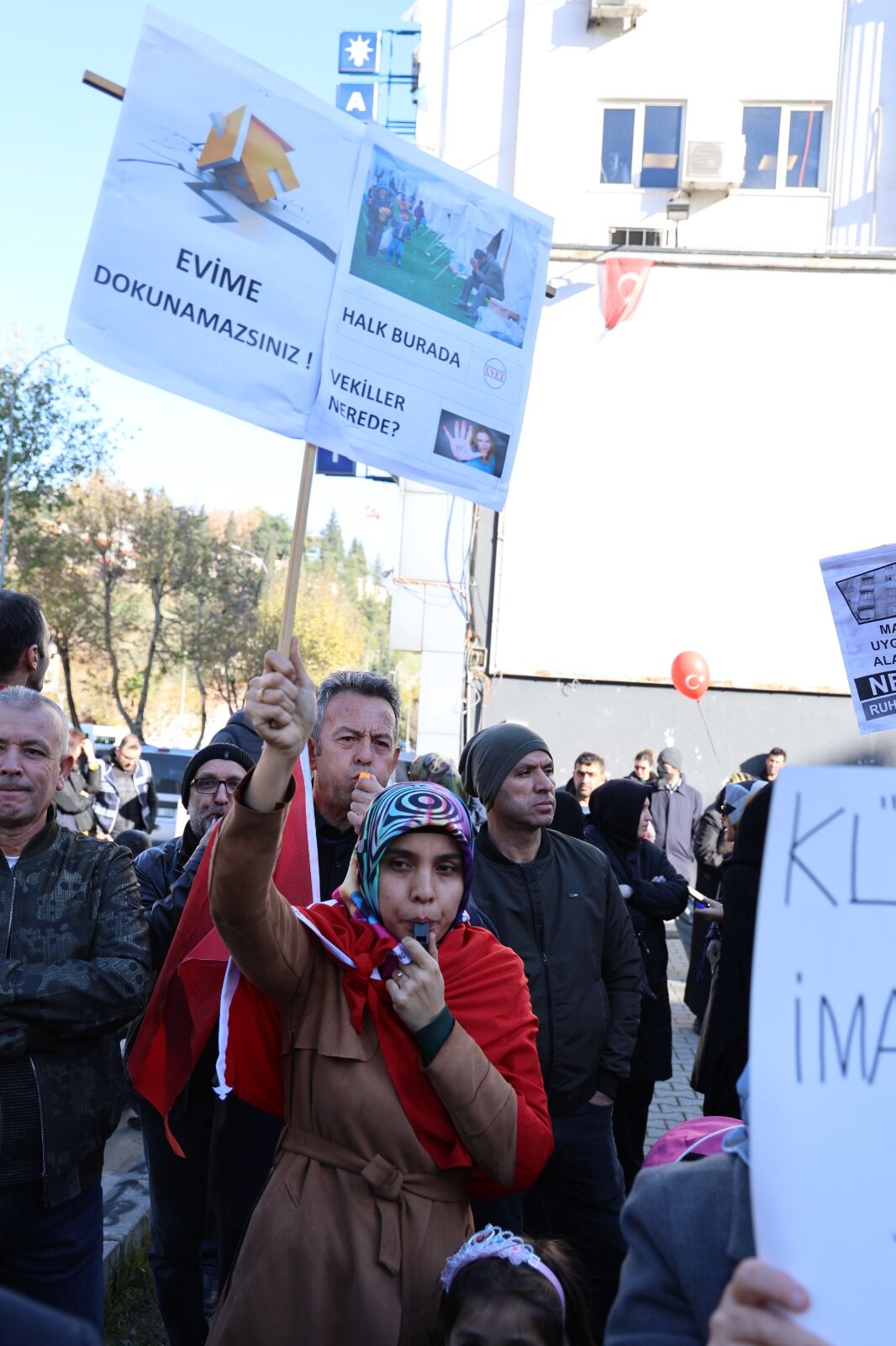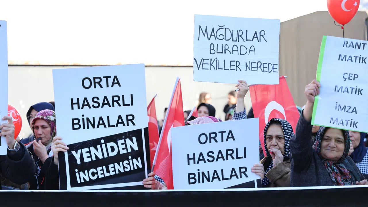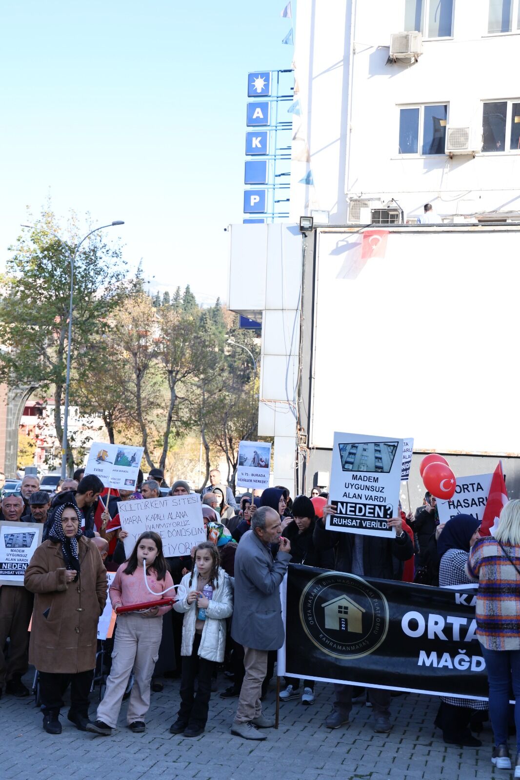 Kahramanmaraş Orta Hasarlı Bina Mağdurları Platformu'nun organize ettiği protestoya, pankartlarıyla, düdükleriyle mağduriyetlerini dile getirmek isteyen vatandaşlar katıldı. Ellerindeki düdüklerle seslerini duyurmaya çalışan eylemciler, parti binası önünde platform adına açıklamalarda bulundular.