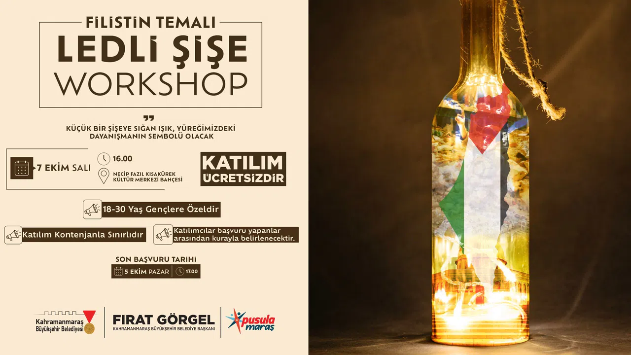 7 Ekim Salı günü Necip Fazıl Kısakürek Kültür Merkezi bahçesinde gerçekleştirilecek “Filistin Temalı Ledli Şişe” atölyesi, 18–30 yaş arası gençlerin katılımına açık olacak. Etkinlikte, küçük şişelere yerleştirilecek ışıklarla hem dayanışma simgesi oluşturulacak hem de Filistin halkına destek mesajı iletilecek.