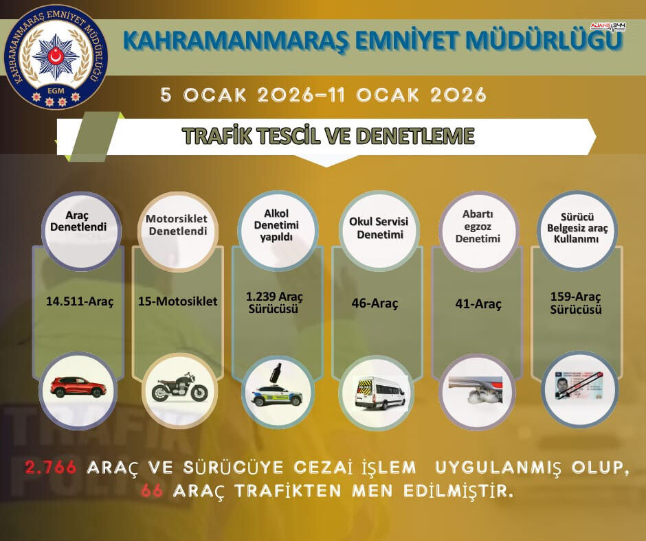 Kahramanmaraş Emniyet Müdürlüğü, şehir genelinde trafik güvenliğini sağlamak amacıyla yürüttüğü denetimlere ilişkin haftalık verileri kamuoyuyla paylaştı. 5 Ocak ile 11 Ocak 2026 tarihleri arasında gerçekleştirilen uygulamalarda 14 bin 511 araç ve sürücü kontrol edildi.