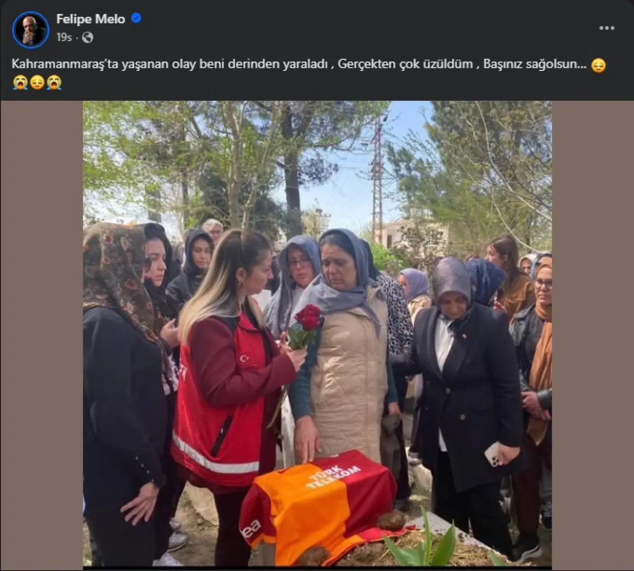 Ünlü futbolcu Felipe Melo’nun Kahramanmaraş’ta yaşanan üzücü olay sonrası yaptığı paylaşım geniş yankı buldu. Sosyal medya hesabından yaptığı açıklamada derin bir üzüntü yaşadığını ifade eden Melo, taziye ziyaretinden bir kareyi takipçileriyle paylaştı.